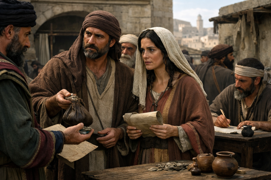 Ananias et Saphira, deux chrétiens, vendent leur terrain afin d’en reverser les bénéfices à la communauté. Ils décident cependant, en secret, de conserver une partie de la vente.