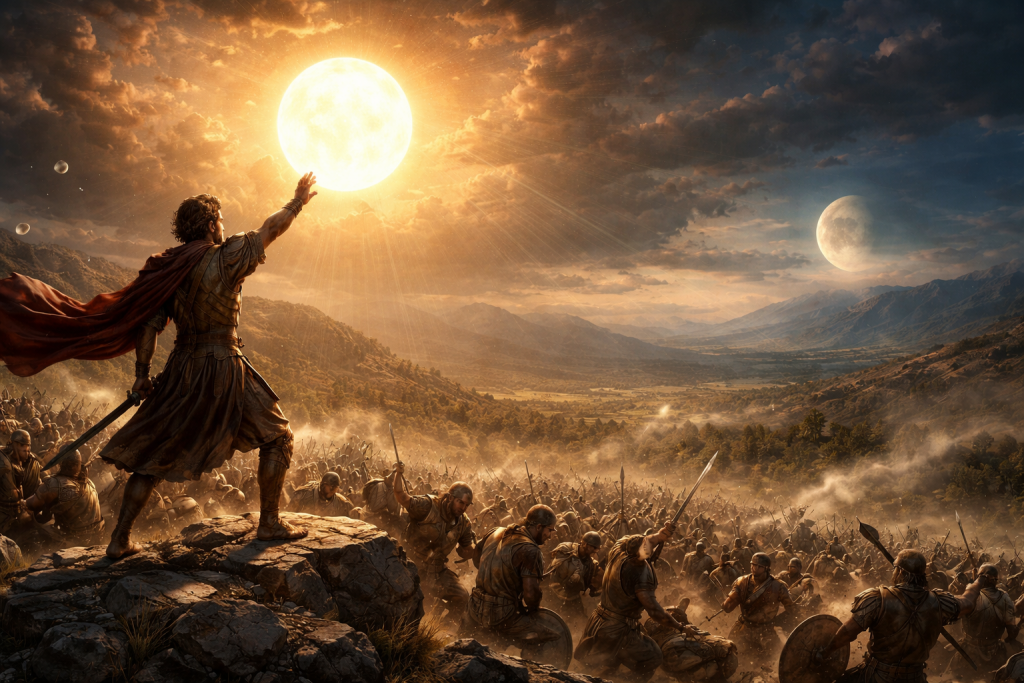 Le chef israélite Josué a besoin d’une victoire écrasante, il demande à Dieu d’arrêter la Soleil et la Lune pendant un jour et Dieu l’exauça.